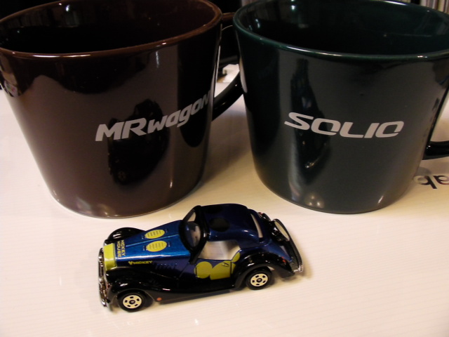 今日はスズキの試乗会。 MRワゴンとソリオの試乗会がディスニーランドの傍(舞浜)でありました。 2台とも室内がとても広く、質感もハンドリングもかなり高得点のモデルでした。 ここのところスズキの進化に感心しています。 ところで、試乗会に行くとよくお土産をいただきます。 クッキーなどおやつ系も多いのですが、今回のようにマグカップは助かります。 ボクはコーヒー好きなので、新しいものが増えると欠けたりした古いカップを捨てられます。 ところでカップの前にあるミニカーは SUBARUオリジナル ディズニーモータース ドリームスター というミッキーのオリジナル。実は、これ非売品です。 スバルとディズニーのコラボで個数も少量限定モノだとか。 ヤフオクでスゴイ値段が付いているとも。 先週の河口湖で行われたスバルの新エンジン試乗会で頂きました。 ボクはヤフオクには出しませんよ。 さて、明日(いや本日)はいよいよスローエイジングの講演です。 お話しすることをまとめなくては(汗)