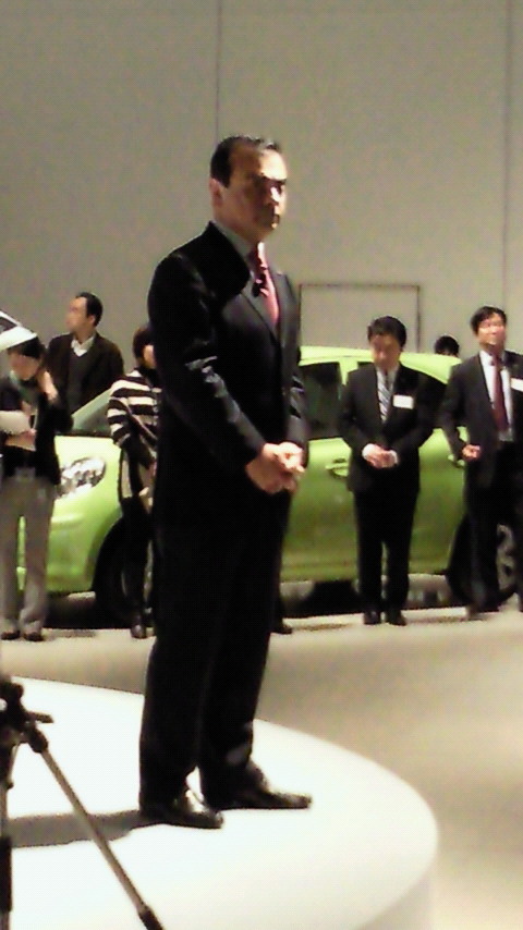 離れて見ると力強く美しい字だけれども、あんな大きな字を接近して書いて、よくあんなにキレイに書けるものだと感心(@゜▽゜@) 「挑」今年はたくさんのことに挑まなくてはなりません。 日産自動車だけでなく、日本の全ての人が頑張らなくては…ヤバいですよ。 この言葉と文字、今年はいただこう! そして、常に挑み続けるカルロス・ゴーン氏のご挨拶も。 生ゴーン氏、意外に小柄ですけど凛としたもの、キレの良さを感じます。 残念ながらお話することはできませんでした。 今日、トヨタ・ホンダ・日産さらに石油及びガスの各社による 「燃料電池自動車の国内市場導入と水素供給インフラ整備に関する共同声明」 というものが発表されました。 もうエコカーじゃないとクルマじゃないという雰囲気になってきました。 日本が世界をリードするには、この環境技術を売りにするしかないのですね。 悪いことではないのですが、この双雲氏のようにクルマの文化面でもリーダーになってほしいのですが…。 |