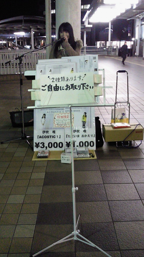 しかし、時間がないのでものの1分間ほど聞いただけで目的地に向かいました。 約2時間強後、同じ場所で彼女はまだ唄っていました。 2時間前と同じ素晴らしい歌声で。しかも、たくさんの人だかりに囲まれ。 この日は強烈に寒かった。 一生懸命なにかに打ち込んでいる人って人っギターをて伝わってくるものがある。 彼女にとって寒さなんかどうでもよいことなんでしょう。 2件目に向かわなければならず、またすぐにその場から離れてしまったけれど。 本当はもっと聞きたかった。 昨夜、テレビを付けたら歌謡大賞??のような番組をやっていた。 ギターを持って“おばあちゃん”(歌詞しかわからず失礼)の歌を聴き品川駅の彼女や自分のおばあちゃんのことを思い出し、涙が出た。 でも“おじいちゃん”を歌う曲はあまり記憶になく、しかも涙とは程遠いもののように思う。 おばあちゃんも品川の彼女も女性。 男って悲しい生きものだ。 皆さん、良いお年を!!!