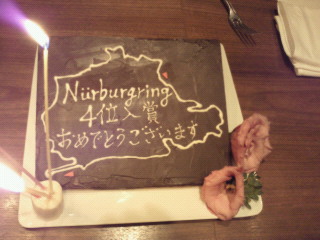 食事もワインも美味しかった! ニュルブルクリンクのコースを描いたケーキをお店の方が作ってくださいました。 デザートがまたイケル! 左下のケーキのかけらは、それぞれドライバーが一番好きなコーナーの部分を切り取って食べました。 ちょっと分かりにくいのですが、ボクが好きなのはオールドコースの最後にある長いストレート。 その先にGPコースと連結される高速S字です。 減速しすぎるとロスするし、ミスると確実にクラッシュします。 でも、決まったときの気分は最高! ここはGT5でも得意なんです。(GT5ではここだけなんですが) 今回のレースでの収穫は、フィニッシュする最後までエンジンとトランスミッションのフィーリングにまったく変化がなかったことです。 しかもトランスミッションは8速のAT(オートマチック)。 エンジンもATもラインから生産されたどノーマルです。 ハンドリングも素晴らしかったこと、VLNという4時間の耐久レースに数回出場して実戦での準備を進めたのですが、回を追うごとにラップタイムが速くなり、BMWなどからマークされ始めたこと。 そんな話に花が咲きました。 レクサスさん、ありがとうございました。